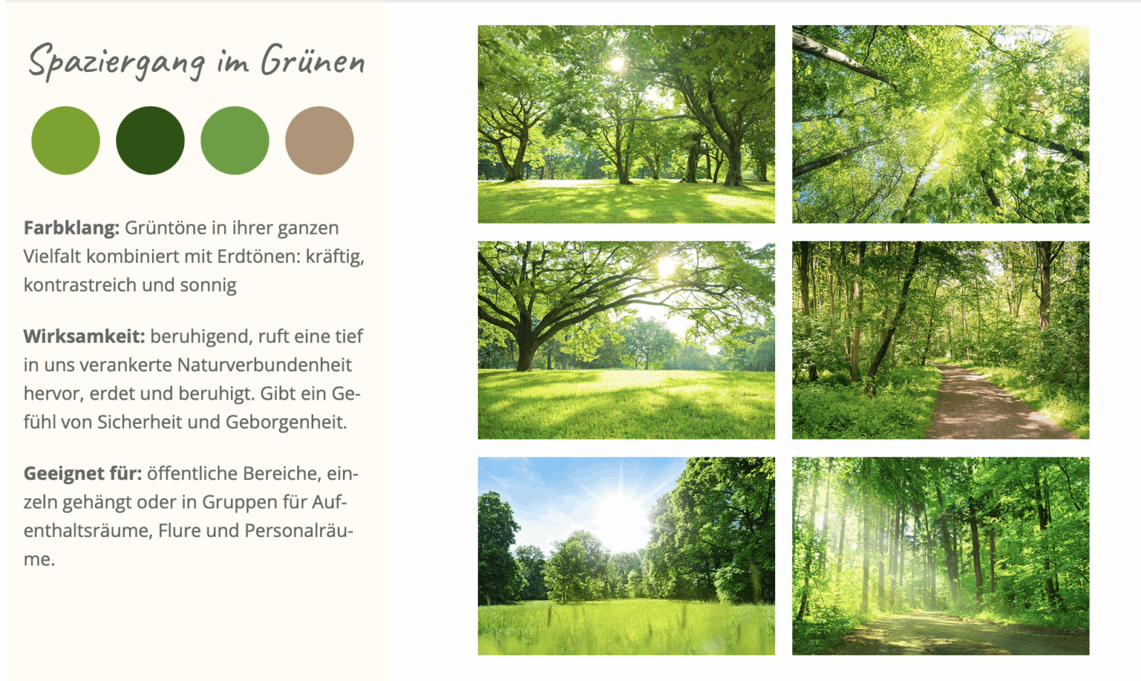 • Stimmungsaufhellung: Naturerlebnisse – selbst durch Zimmerpflanzen oder Naturbilder – fördern die Ausschüttung von Endorphinen, den sogenannten Glückshormonen.