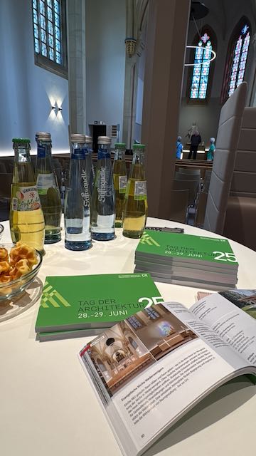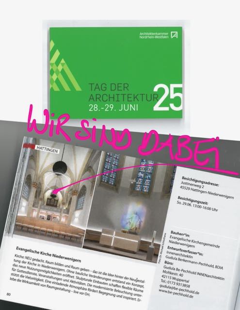Ich habe das erste Mal mit einem Projekt am Tag der Architektur teilgenommen. Es waren 24 Interessierte vor Ort und es waren sehr nette Begegnungen mit sehr unterschiedlichen Menschen. Ein sehr netter Austausch und ein allgemein sehr positives Feedback auf die Gestaltung der Kirche. Das hat mich sehr gefreut und ich war richtig stolz auf mein Herzensprojekt. Womit ich nicht gerechnet hatte, war die Öffentlichkeit in der Pressearbeit vor der eigentlichen Veranstaltung. Es gab einen Zeitungsartikel Ende 24 schon im Zusammenhang mit dem Tag der Architektur in der WAZ Hattingen, und wie sich später herausstellte, war die ganze Seite auch in Bochum erschienen, einen Bericht im DAB, der offiziellen Zeitschrift der Architektenkammer, und dann die Broschüre der Veranstaltung selber. Und meine Kirche war fast immer als Beispielbild dabei. Und ich habe jetzt, Ende 2025, von einer Gemeinde in Bochum einen Auftrag erhalten, aufgrund dieses Zeitungsartikels!