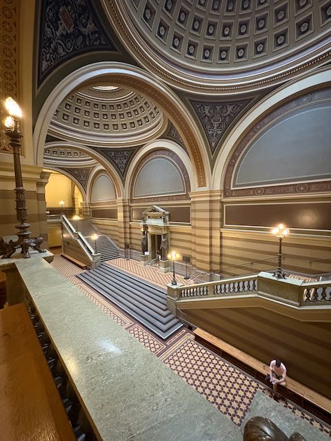 Und endlich – ich glaube es war der 4. Versuch: Ich habe die Eingangshalle der ältesten Universität Schwedens gesehen. Die Eingangshalle des 1887 eröffneten Hauptgebäudes der Universität Uppsala ist eine repräsentative, neorenaissance Vorhalle, die mit ihren hohen Säulen, großzügigen Treppen und reich gestalteten Wandflächen den feierlichen Charakter des Hauses prägt. Sie dient bis heute als offener, frei zugänglichen Empfangsraum und wird häufig für Ausstellungen, Empfänge und Registrierungen genutzt. Und ich bin beeindruckt von der Atmosphäre, die sie ausstrahlt.