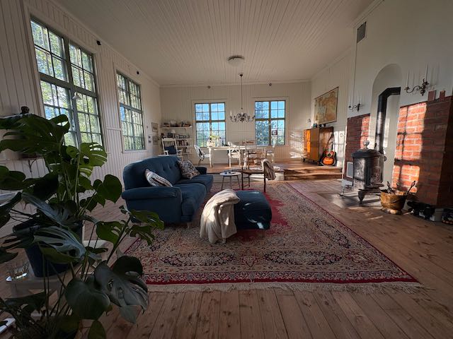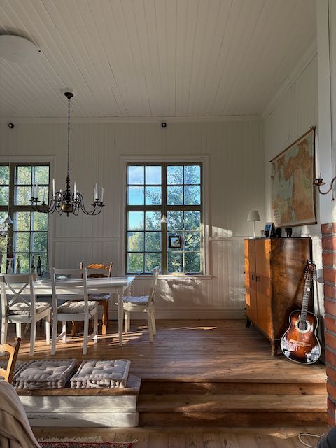 Runhällen ein Ort im Nichts mit ca. 360 Einwohnern. Und dann nochmal weiter ins Nichts bis Enekar Lund. Eine Schotterstraßen-Sackgasse mit 5 Häusern und der alten Dorfschule von 1917. Die hat er sich ausgesucht. Für mich als Innenarchitektin ein Traum. Ein Holzhaus auf einem riesigen Grundstück, mit einem zentralen Raum ( dem ehemaligen Klassenraum) von über 50qm, mit einer Deckenhöhe von 3,65m! 5 riesige Fenster, einem Böllerofen und einem Podest, auf dem früher das Lehrerpult stand. Das ist Raum.