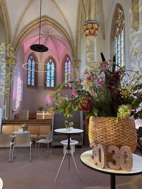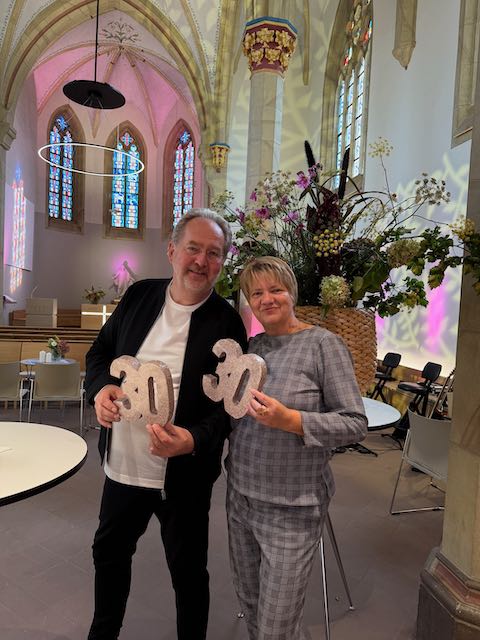 Eine Idee, wo wir feiern, war sofort da: Wir feiern in der Kirche, die ich neu gestaltet habe. Das ist einfach ein toller Ort, eine besondere Atmosphäre, und es hat etwas mit mir zu tun. Auch mit Uwe, denn hier ist er mit seiner Band Stolberk schon einige Male mit dem legendären Weihnachtskonzert aufgetreten. Am Ende der Sommerferien haben wir dann unsere Einladung verschickt.