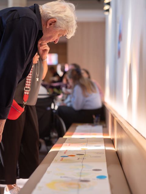 Die Idee war, unsere Lebenslinie aufzumalen und die wichtigsten Ereignisse dort einzutragen. Ich habe ein Leporello gebastelt und es ist über 4 Meter lang geworden, 60 Jahre sind eine lange Zeit! Unsere Freunde haben sich dann, mit einem Punkt an die Stelle eingeklebt, wo wir uns das erste Mal getroffen haben. Das gab viel Gesprächsstoff auf unserer Feier, und alle sind in unsere und damit auch in ihre eigene Geschichte eingetaucht. Wir haben jetzt eine tolle Lebenslinie, einen Überblick über unser Leben, viele Erinnerungen sind wieder präsent und Zusammenhänge sind klar geworden.